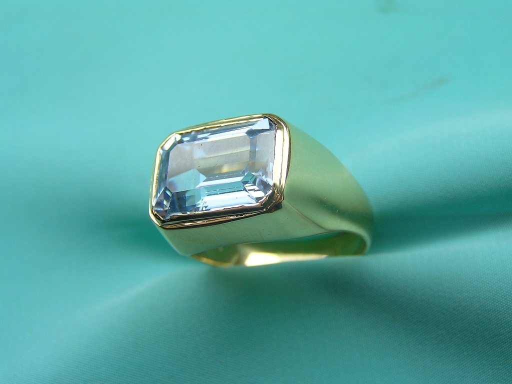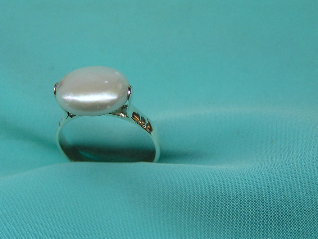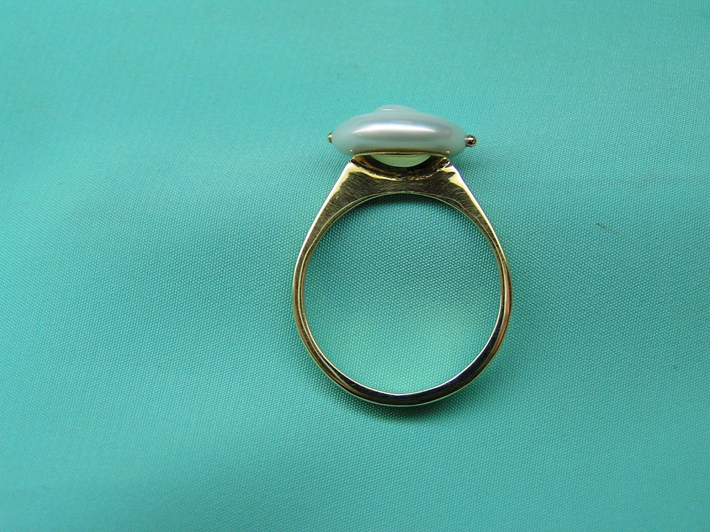 Anillo de oro con brazo cuchilla y perla cultivada plana.