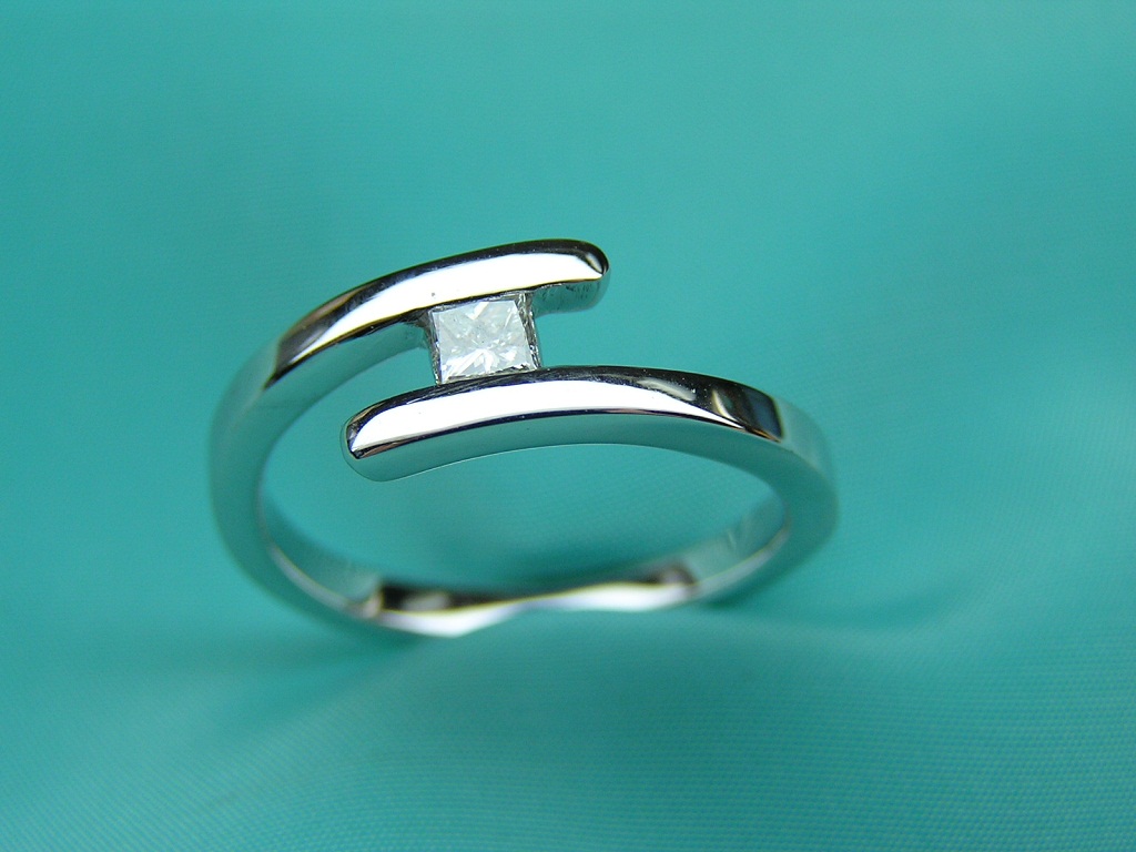 Anillo de oro blanco con brazo abierto y diamante talla princesa.