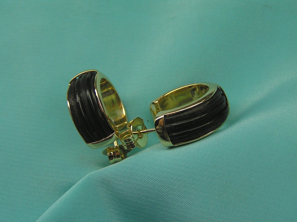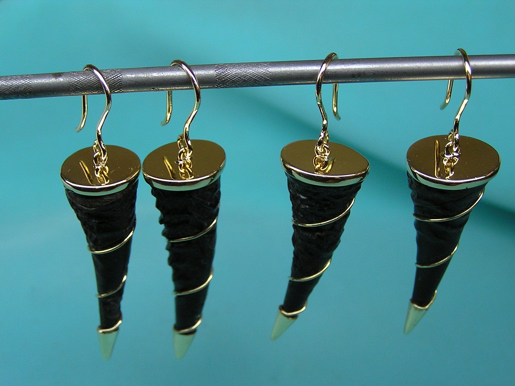 Pendientes de oro con cuernos negros e hilo alrededor.