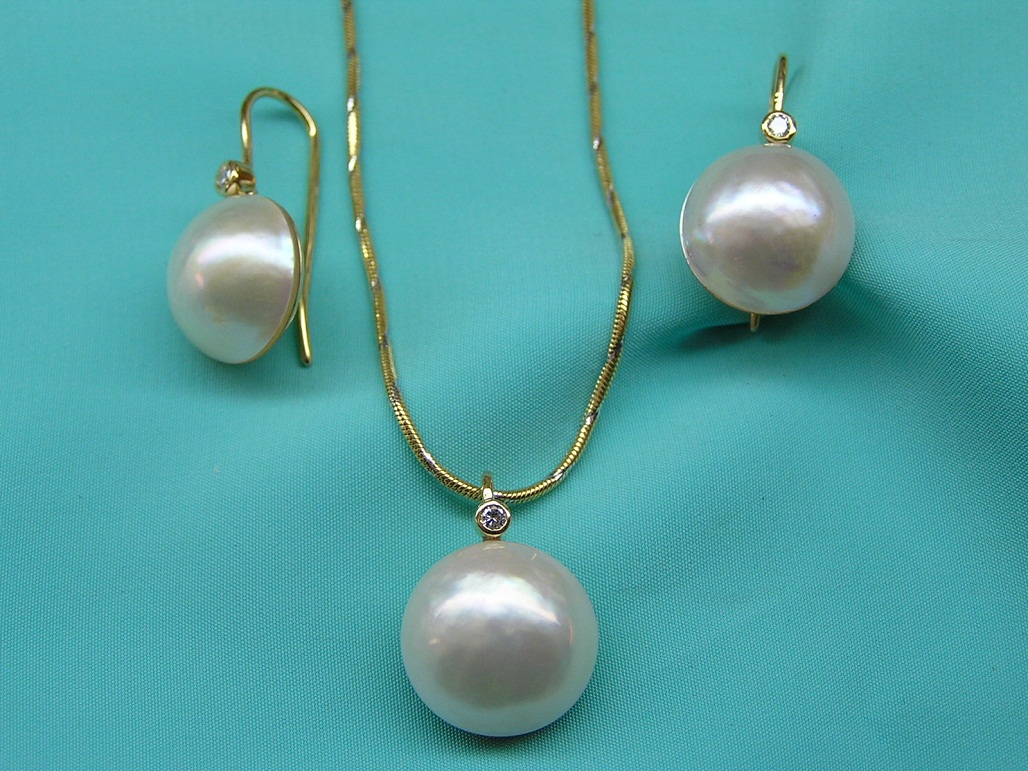Conjunto de oro de pendientes y colgante con perla japonesa y diamante.