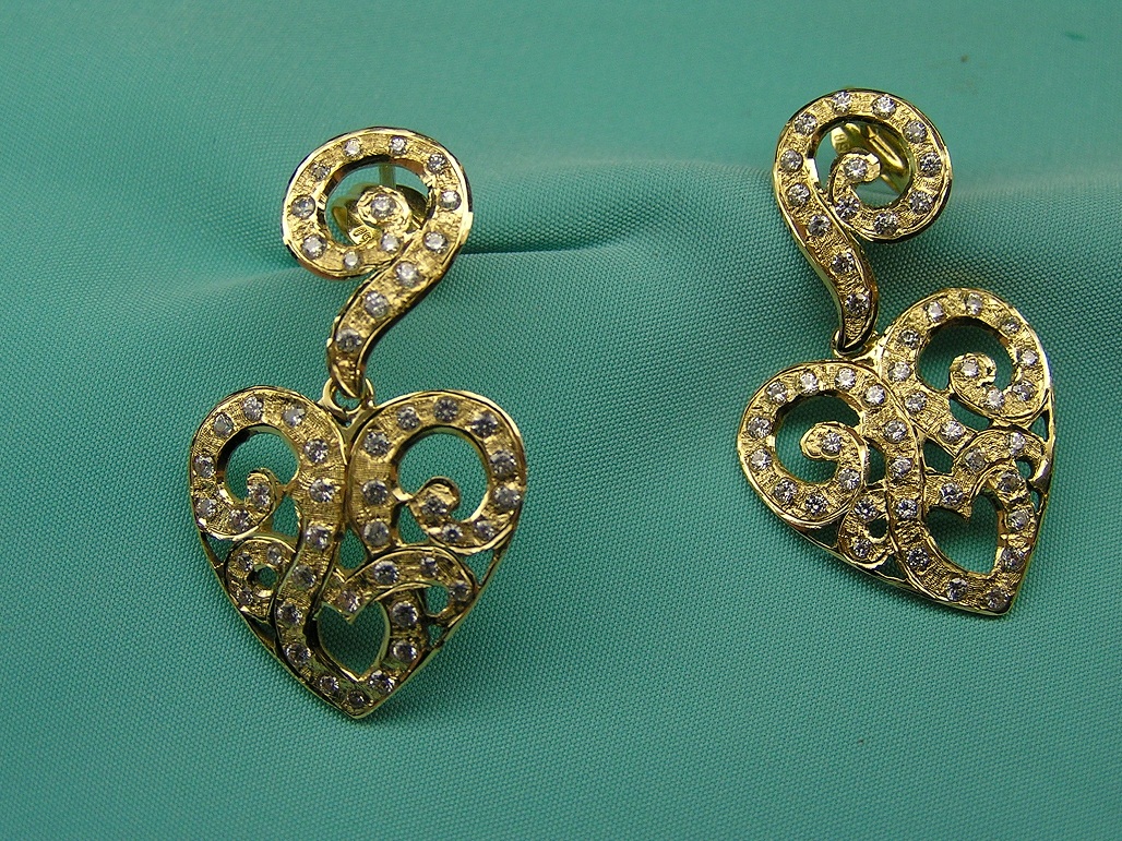 Pendientes de oro de colgar formas de corazón plagados de zirconitas