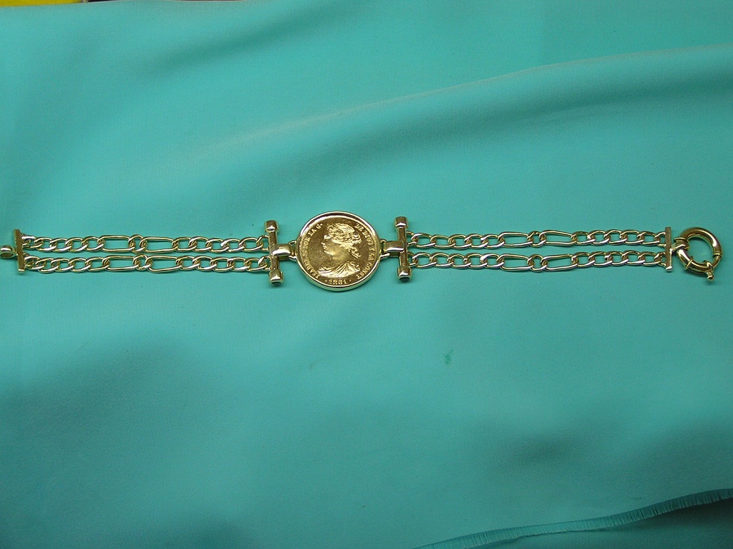 Pulsera de oro dos cadenas centro moneda de oro y barritas con zafiros.