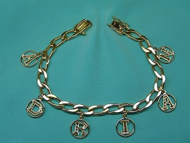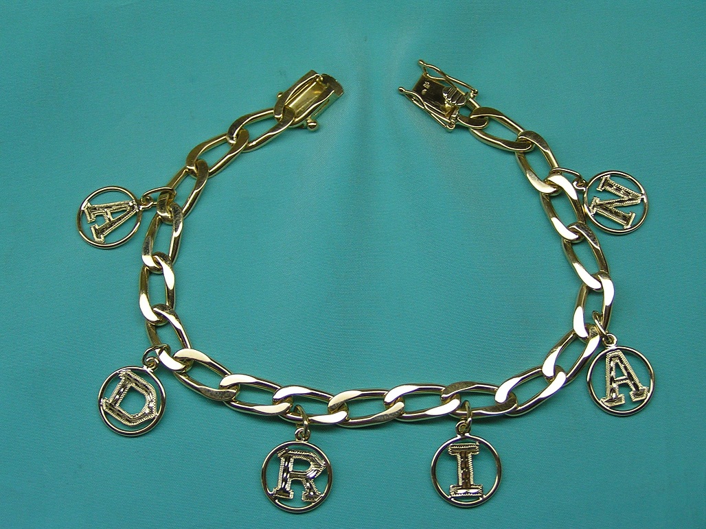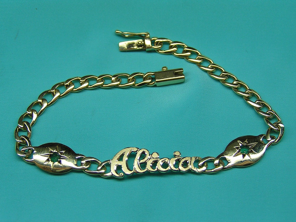 Pulsera de oro con nombre letra inglesa y dos esmeraldas.