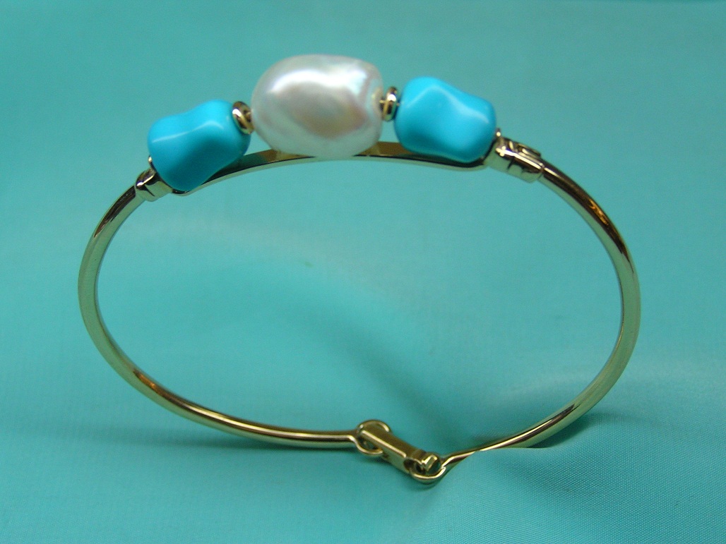 Pulsera de oro media caña con dos perla cultivadas y turquesa centro.