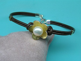 Pulsera plata y oro con perla cultivada sobre forma flor y cueros.